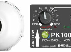 - 1 x 100mm PK-TC Kanalventilator med en Variabel Hastighed på op til 280 m3/t med Integreret temperatur controller som gør det muligt at indstille i minimums hastighed og ønsket temperatur.